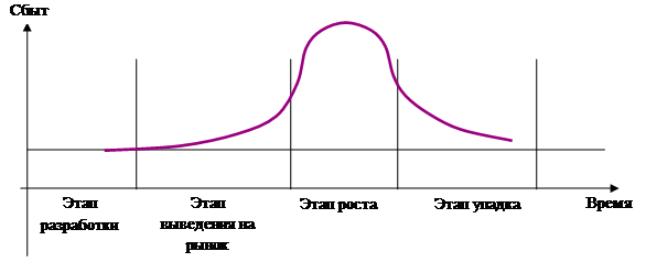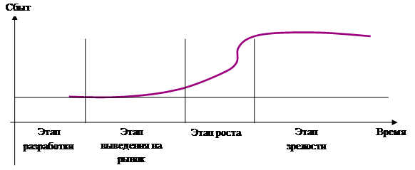 Объем продаж определенного вида товара зависит от того, в какой стадии своего жизненного цикла находится продукт. График продаж представляет собой кривую, которая сначала возрастает, затем стабилизируется и, наконец, опускается (рис. 4).