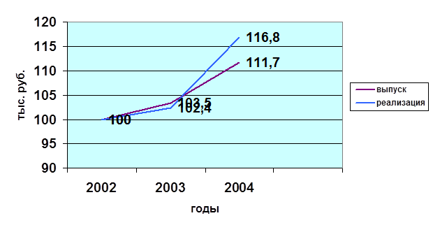 Из таблицы видно, что за три года объем производства вырос на 11,7 %, а объем реализации продукции увеличился на 16,8%. То, что за 2004 год темп производства продукции ниже темпа реализации, говорит о том, что нереализованная продукция на складах предприятия и неоплаченная покупателями в 2003 году реализована в 2004 году полностью.